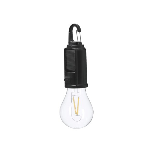 Lampara con original diseño de bombilla con cuerpo en ABS. Batería de 300 mAh y carga solar. Dispone de sensor nocturno que se activa automáticamente al no recibir luz solar. Dispone de carga a través de cable Tipo C, además de incluir mosquetón para fácil transporte. Carga Solar. Sensor Nocturno. Batería 300 mAh