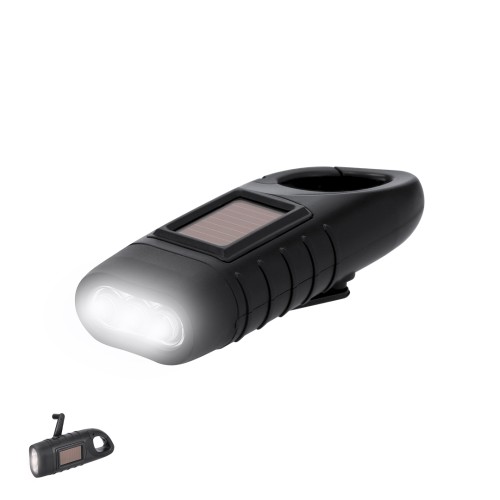 Linterna en ABS Reciclado con carga solar y carga manual con sistema dinamo ajustable de 360°. Dispone de 3 LEDs de luz blanca alimentada tanto por panel solar recargable como por 3 pilas de tipo botón de 40mAh. Incluye una funcional asa de agarre en forma de mosquetón pudiendo ser fácil de transportar. Una solución práctica para mantenerse siempre preparado. 3 Ledes. Carga Solar y Manual. Batería 40 mAh