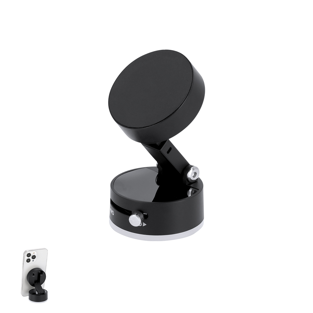 Soporte magnético para teléfono en ABS. Sujeción a través de ventosa con botón de activar/desactivar ON/OFF. Incluye anillo metálico magnético . Dispone de un soporte retráctil ajustable, ideal como solución para asegurar tu dispositivo de forma estable y versátil en cualquier superficie. Magnético y Ventosa. Plegable. Altura y Ángulo Regulable
