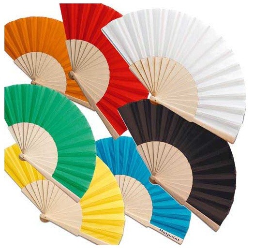 Abanico de varillas de madera natural y tela en poliéster de variados colores. Presentado en caja individual.