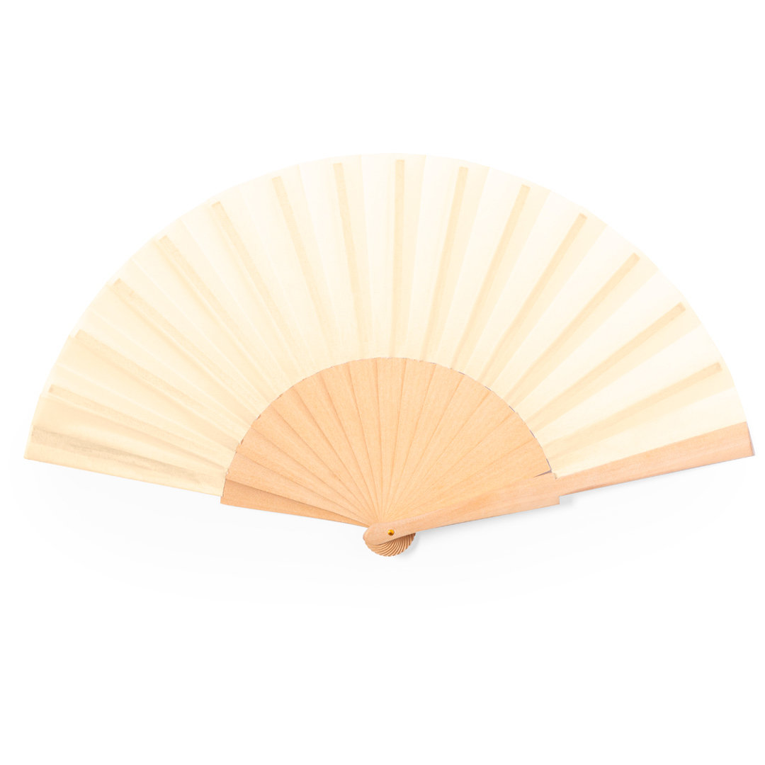 Abanico fabricado con varillas de madera y tela en algodón en combinación con el poliéster. De color natural y presentado en caja individual diseño kraft.