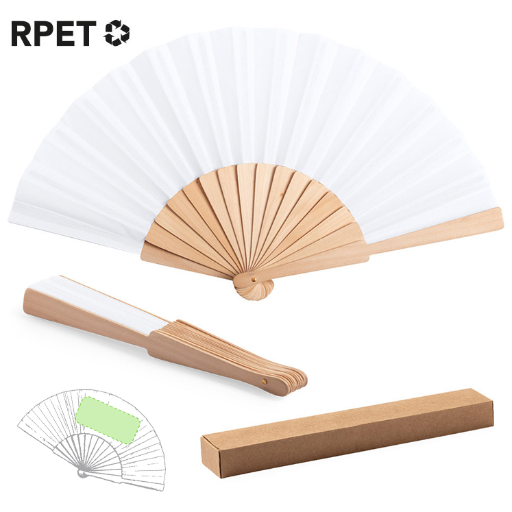 Abanico de línea nature, con varillas de madera y tela en RPET, elaborado a partir de plástico reciclado, para así fomentar la reutilización de residuos plásticos y ayudar a la sostenibilidad del planeta. Presentado en caja individual de diseño eco.