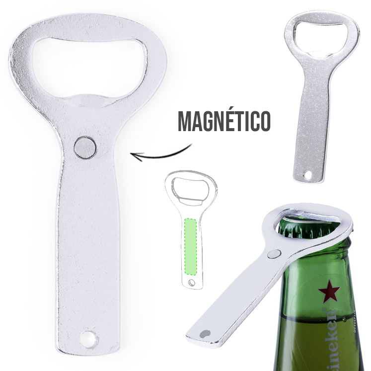 Sencillo y elegante abridor fabricado en aluminio y con imán en el mango. Presentación individual en bolsa autocierre. Magnético