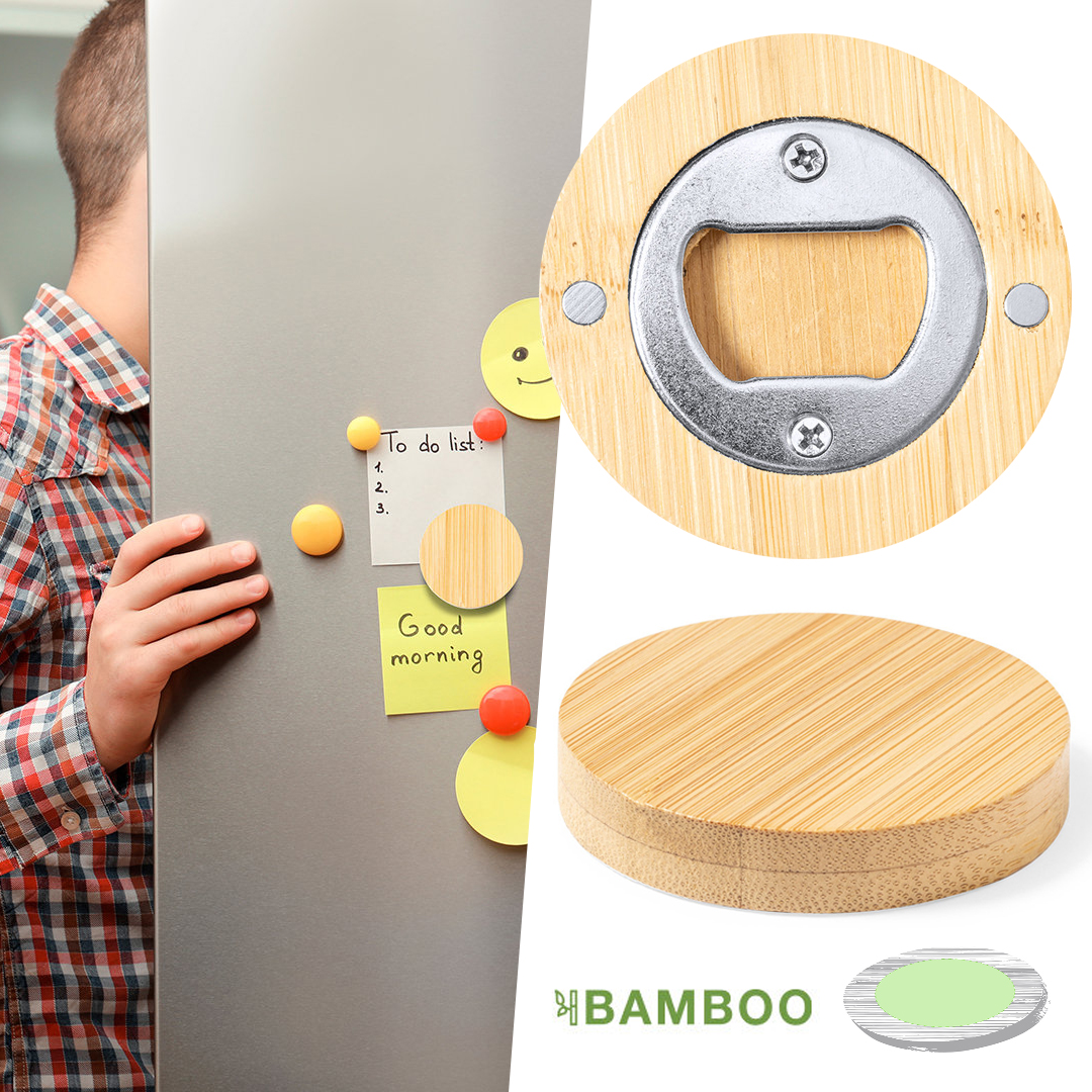 Original abridor magnético de línea nature, fabricado en resistente bambú, con sistema de apertura metálico. Magnético