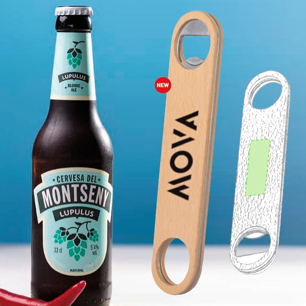 Abridor de madera de haya pulida con interior en acero inox, con troquelado para colgar.