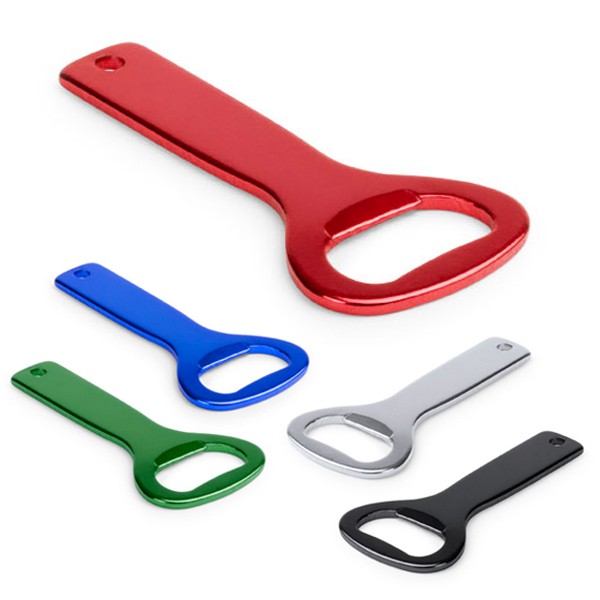 Abridor de aluminio en variada gama de vivos colores. Con mango troquelado para lanyard -no incluido-. Especialmente diseñado para marcaje en láser.