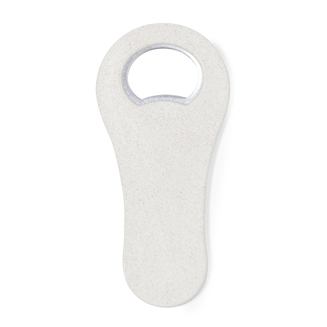 Abridor de botellas fabricado en caña de trigo. Cuenta con un imán que permite adherirlo a cualquier superficie metálica. Presentado individualmente en bolsa de papel reciclada. La caña de trigo fomenta la utilización de materias primas naturales, reduciendo así las emisiones contaminantes. Magnético