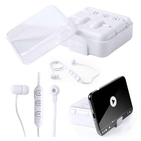 Auriculares intraurales de conexión bluetooth y diseño minimalista en elegante color blanco. De diseño ergonómico, incluyen panel de control integrado en cable, con tecnología de conexión simultánea a varios dispositivos. Con función manos libres y recargables mediante cable mini USB -incluido-. Presentados en estuche individual con soporte para smartphone integrado.