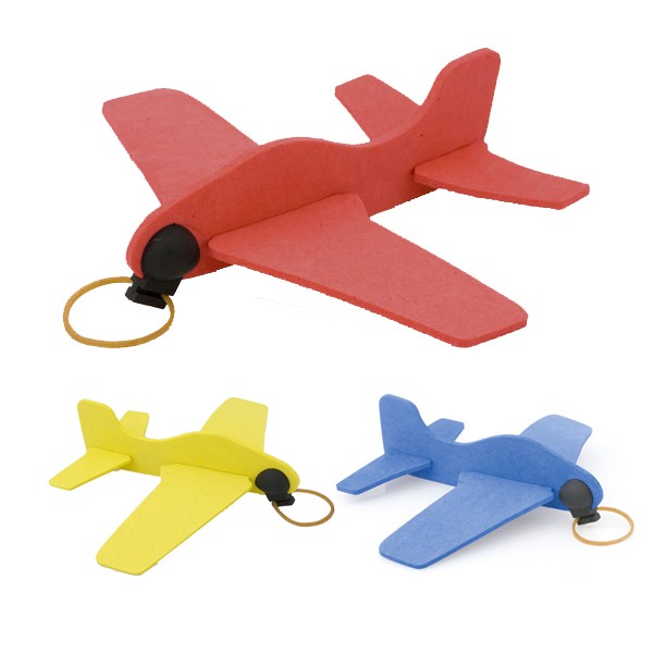 Avioneta desmontable con cuerpo en suave EVA de vivos colores y elástico de lanzamiento. Presentada en pastilla plana para fácil marcaje. Placa: 17 x 13,5 x 0,3 cm. Avioneta: 12,7 x 4 x 15 cm