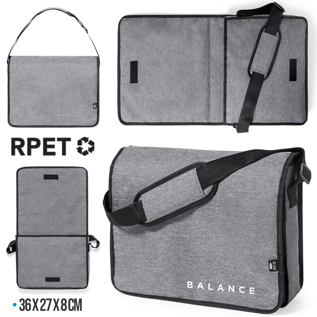 Bandolera fabricada en resistente poliéster 600D RPET. Completamente acolchada, con amplia solapa frontal, cierre de velcro y ribete en negro. Compartimento principal con forro interior, con cinta bandolera ajustable y acolchado para hombro. Con distintivo RPET en etiqueta exterior.El material RPET se elabora a partir de plástico reciclado, para así fomentar la reutilización de residuos plásticos y ayudar a la sostenibilidad del planeta. Acolchada