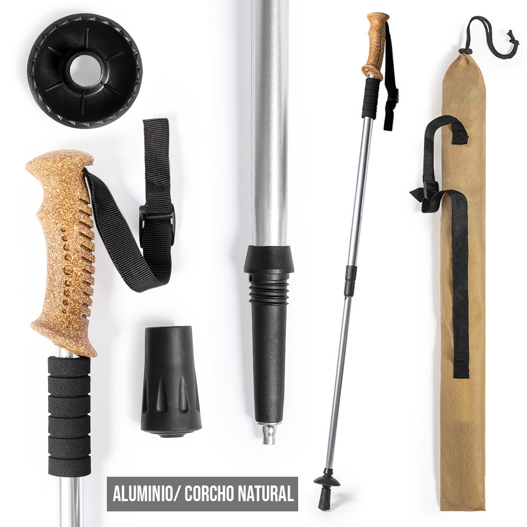 Bastón deportivo plegable y telescópico. Fabricado en resistente aluminio, con confortable mango ergonómico en corcho natural y accesorio de espuma para descansar las manos. Mecanismo de amortiguación, con refuerzo antideslizante en el extremo en contacto con el suelo y cinta de seguridad ajustable. Regulable en altura, incluye accesorio para nieve y viene presentado en funda de transporte en color natural, con cinta para hombro para fácil transporte y cierre en color negro. Plegable. Altura Regulable. Antishock. Accesorio para Nieve. Funda Non-Woven