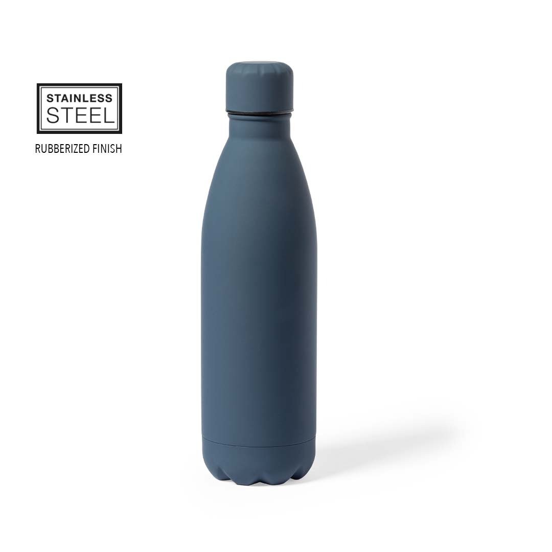 Bidón de 790 ml de capacidad, fabricado en acero inox y acabado con tacto goma, especialmente diseñado para marcaje en láser. Con tapón a rosca a juego, libre de BPA y disponible en variada gama de colores mate. Presentado en caja individual de diseño kraft. 790 ml