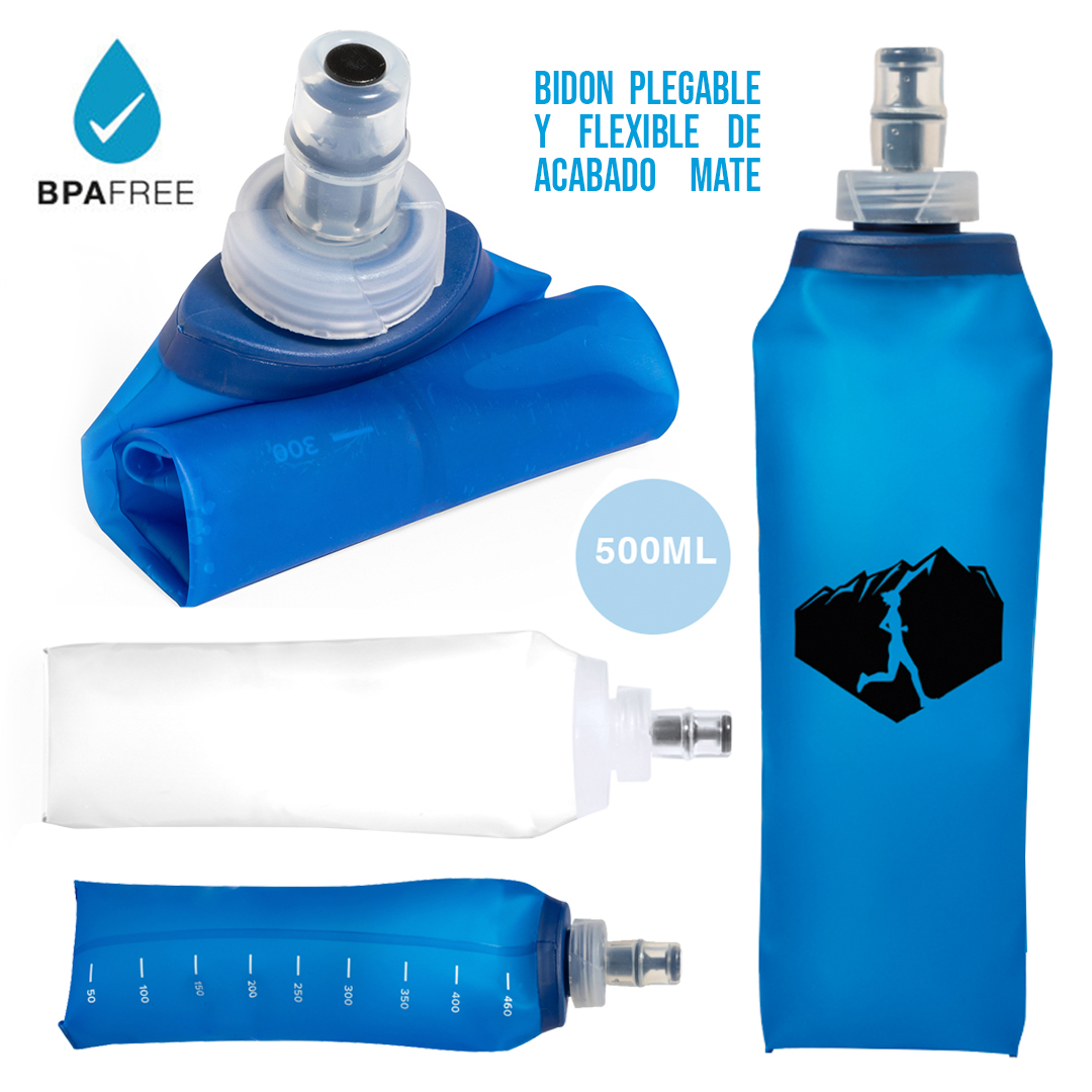 Bidón plegable de 500 ml, práctico y versátil. Su cuerpo flexible de acabado mate permite plegarlo para un almacenamiento cómodo y sencillo. Incluye un dosificador con tapón, y está libre de BPA. 500 ml
