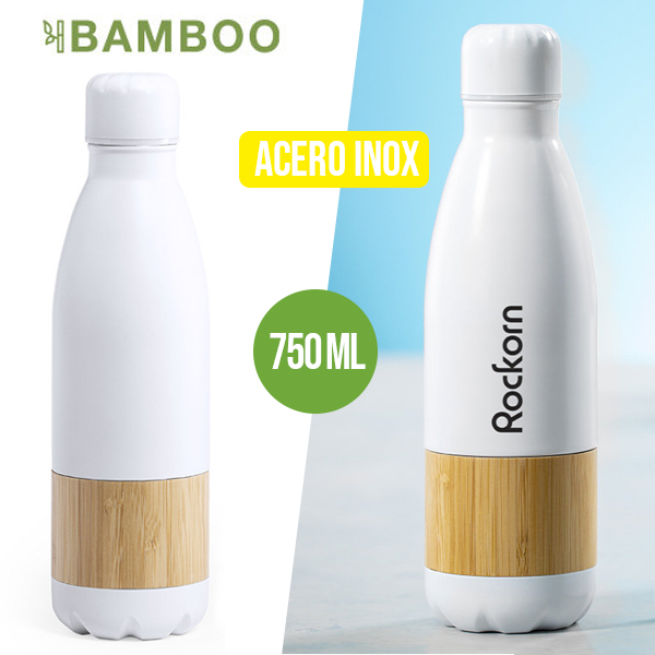 Bidón de línea nature y 750ml de capacidad. Cuerpo de acero inox en acabado mate de color blanco, con franja central en bambú. Tapón de seguridad de rosca a juego y presentado en atractiva caja de diseño eco. 750 ml