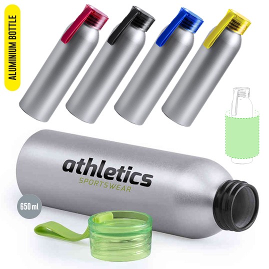 Bidón de aluminio de 650 ml de capacidad. Cuerpo en color plateado, con tapón de seguridad a rosca en variada gama de colores transparentes. Cinta de transporte en material TPR a juego. 650 ml