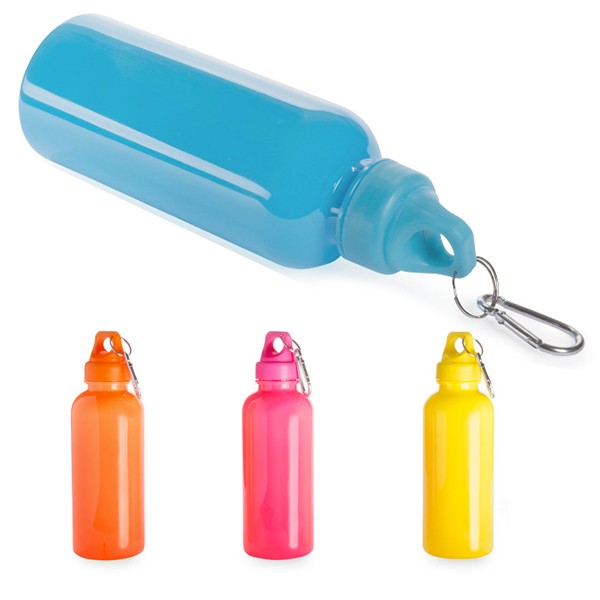 Bidón de 600ml de capacidad con cuerpo de acabado en PS translúcido de vivos y variados colores. Con tapón de seguridad a rosca y mosquetón metálico de transporte. 600 ml
