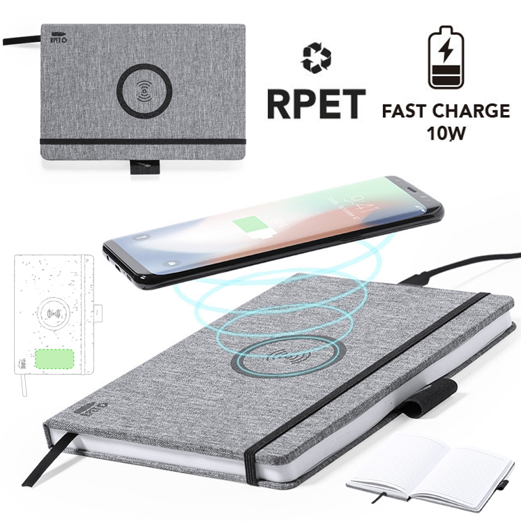 Bloc de notas cargador de línea nature en resistente poliéster 300D RPET de tamaño A5 y elaborado a partir de plástico reciclado, para así fomentar la reutilización de residuos plásticos y ayudar a la sostenibilidad del planeta. Con cargador inalámbrico de 10W integrado en la portada. Incluye 80 hojas con disposición a una raya. Compatible con smartphones con tecnología de carga inalámbrica. Incluido cable de carga Tipo C y disponible manual de instrucciones en español e inglés. Inalámbrico 10W. Portada Rígida. 80 Hojas