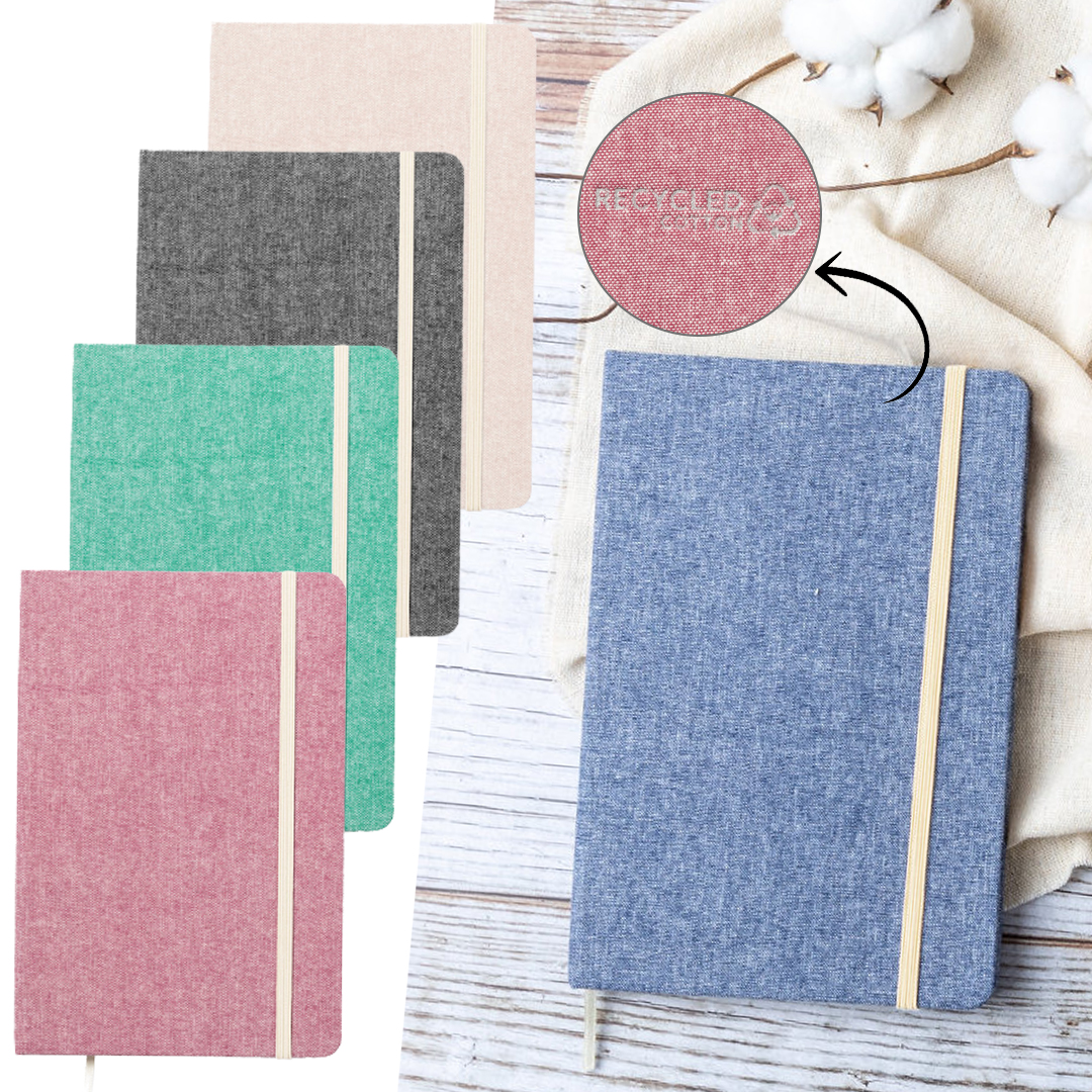 Bloc de notas de línea nature fabricado en 100% algodón reciclado. Con tapas duras y elástico de sujeción en contraste. Interior con 100 hojas lisas y marcapáginas de tela. Disponible en amplia gama de colores, con distintivo algodón reciclado en la contraportada. Certificación GRS (Global Recycled Standard / Estándar de Reciclaje Global), que garantiza el origen reciclado del material usado para fabricar el producto Portada Rígida. 100 Hojas