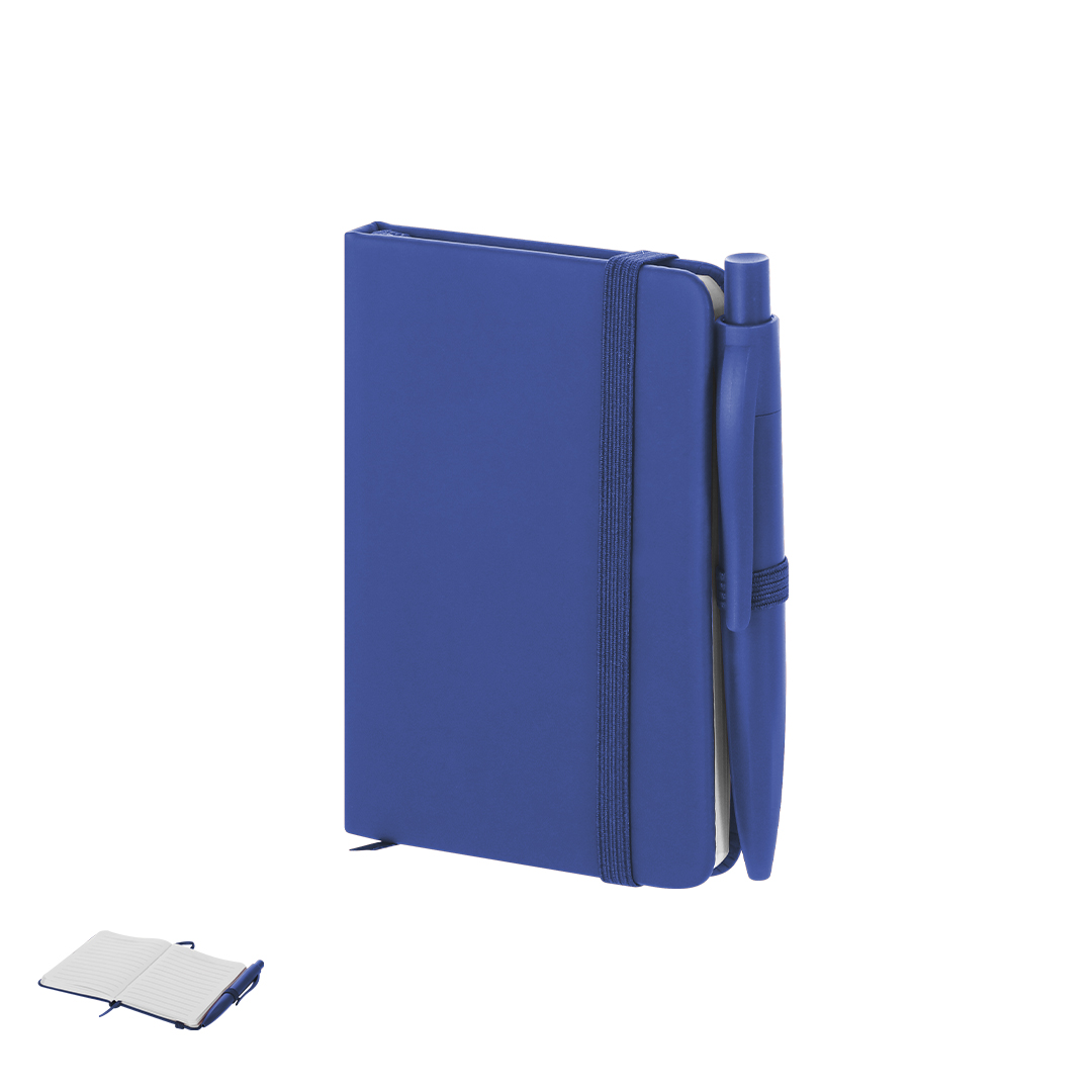 Bloc de notas con tapas rígidas en PU. Incluye 80 hojas en disposición de una raya, elástico de sujeción, marcapáginas de tela y bolígrafo a juego. Portada Rígida. 80 Hojas. Bolígrafo Incluido