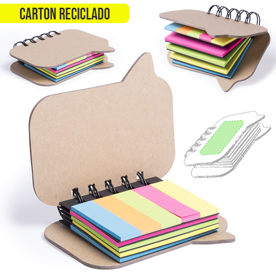 Original bloc de notas adhesivas de anillas con diseño de bocadillo y tapas de suave tacto acabadas en resistente cartón reciclado rígido. Con 100 notas adhesivas grandes y 125 mini notas adhesivas. 100 Notas Adhesivas 5,1 x 7,5 cm. 125 Mininotas Adhesivas 1,5 x 5,1 cm
