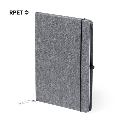 Bloc de notas de línea nature. Con tapas rígidas fabricadas en RPET, elaborado a partir de plástico reciclado, para así fomentar la reutilización de residuos plásticos y ayudar a la sostenibilidad del planeta. Interior con 100 hojas de disposición a una raya. Incluye marcapáginas, elástico de cierre y soporte para bolígrafo a juego. incluye distintivo RPET en contraportada. Portada Rígida. 100 Hojas