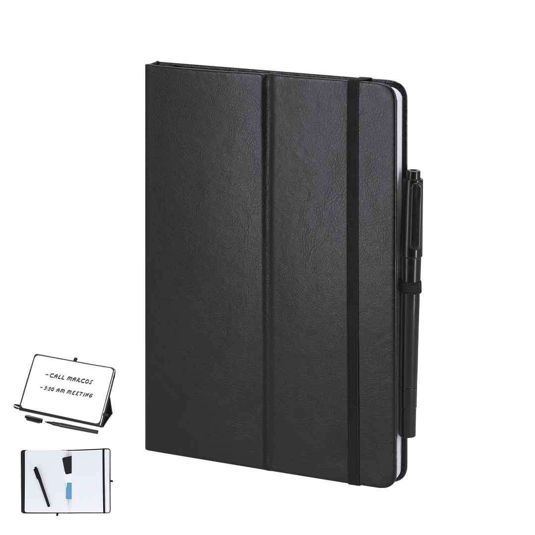 Bloc de notas pizarra en PU reciclado. Con pizarra en primera página, incluye bolígrafo rotulador y borrador en tinta negra. Con 80 hojas a disposición de una raya. Portada plegable con función soporte, y cinta elástica para cierre seguro.Ideal para tomar notas rápidas, apuntes, crear diseños en tu jornada laboral o en casa.Incluye distintitov logo PU Reciclado. 80 Hojas. Bolígrafo Rotulador Tinta Negra y Paño Limpiador Incluido