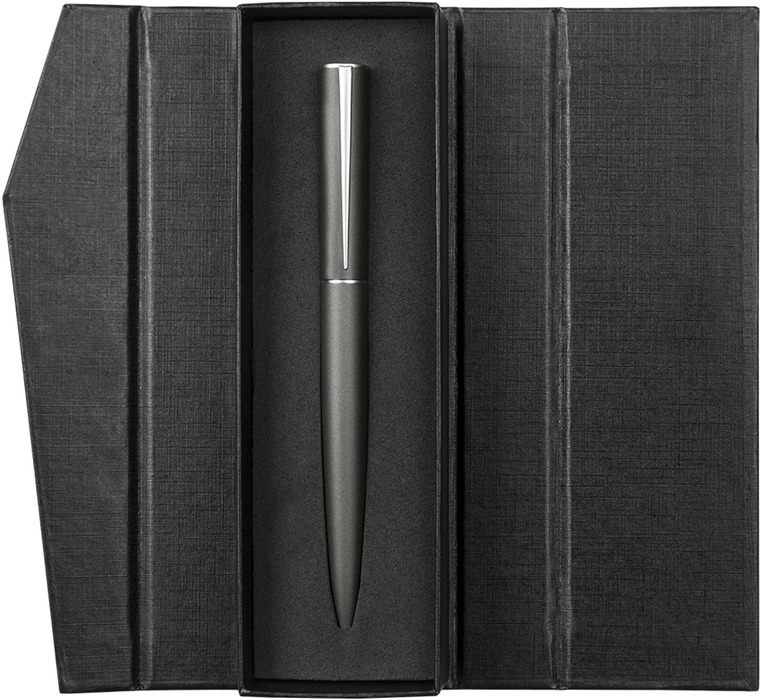 Metálico. Cuerpo color mate. Clip y anillo de acero. Apertura giratoria. Parte superior destapa acero. Parte inferior destapa dorado. Estuche de cartón. Tinta negra. Presentación en estuche con cierre magnético.
