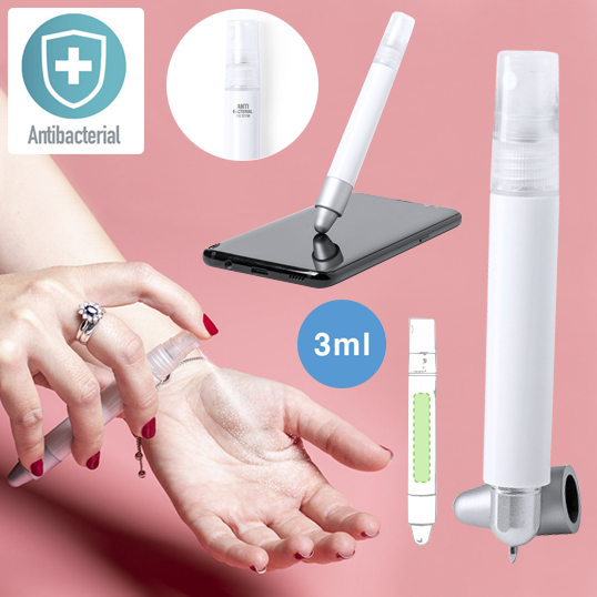 Bolígrafo antibacteriano con pulverizador recargable integrado y capucha protectora con puntero en color gris. Acabado liso en resistente ABS brillante con detalles cromados y escritura en tinta azul. Capacidad del pulverizador 3ml. Líquido no incluido.Los productos con tratamientos antibacterianos son capaces de reducir drásticamente las cargas bacterianas presentes en las superficies de los materiales, gracias a la incorporación de agentes microbianos permanentes estáticos, con alta efectividad para inhibir y prevenir la contaminación bacteriana.Artículo de acuerdo al estándar ISO 22196, que determina la actividad antibacteriana en materiales plásticos y superficies no porosas, lo que permite conocer la efectividad de inhibición microbiana que tienen los aditivos sobre los objetos tratados mediante una evaluación cuantitativa. 3 ml. Líquido No Incluido