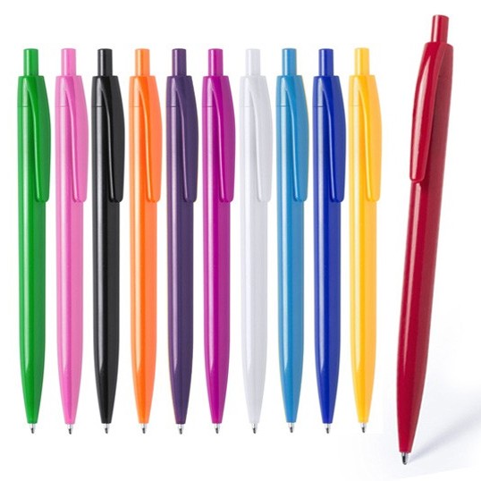 Bolígrafo de mecanismo pulsador con diseño monocolor en variada gama de vivos colores con acabado brillante. Tinta azul.