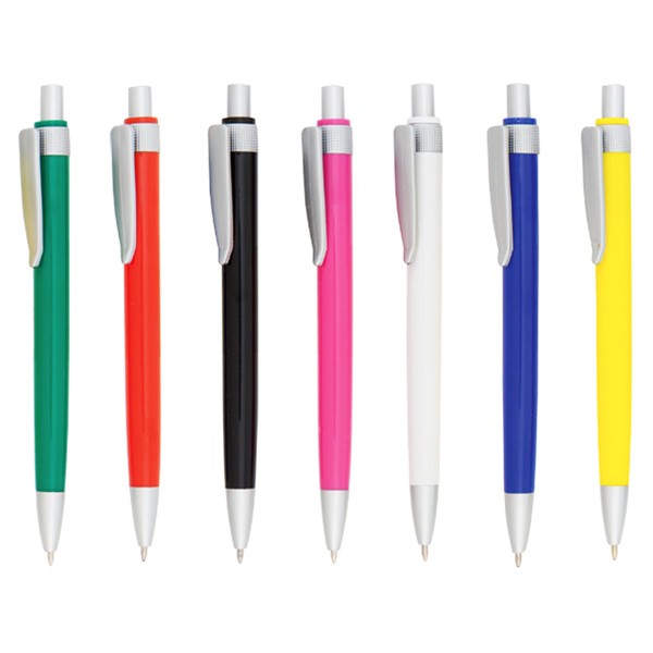 Bolígrafo de mecanismo pulsador de atrevido diseño bicolor con accesorios en gris plateado y cuerpo de suave acabado en vivos colores. Con original clip a juego. Tinta azul.