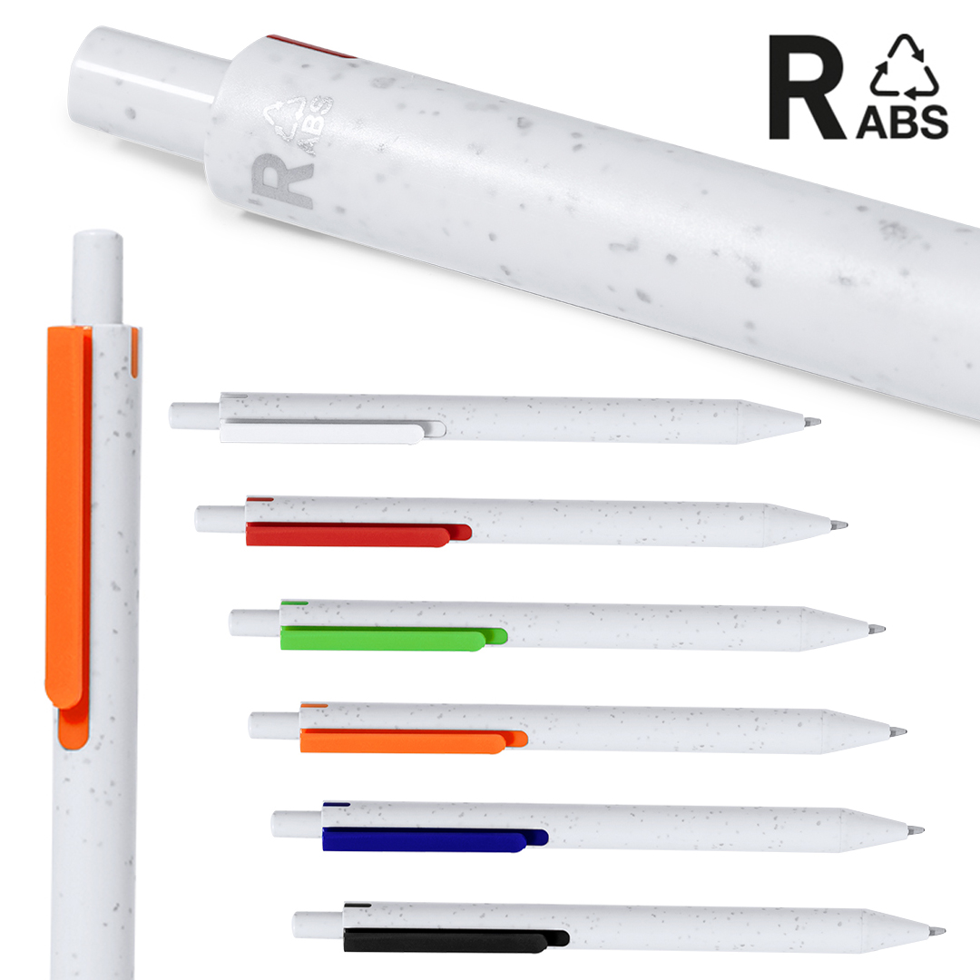 Bolígrafo de mecanismo pulsador fabricado en ABS reciclado. Con clip en vivos colores y cuerpo de suave acabado en color blanco sólido. Distintivo ABS reciclado en la parte superior del bolígrafo. En tinta azul.