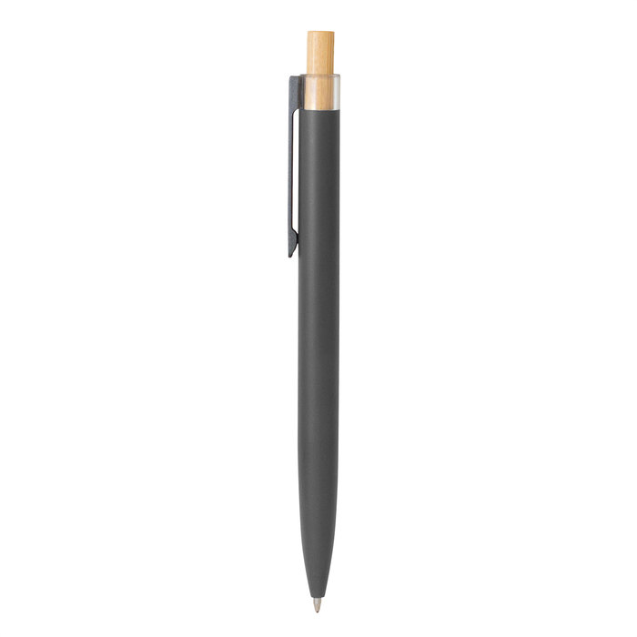 Aluminio reciclado y bambú. Bolígrafo retráctil. Cuerpo metálico en diferentes colores acabado mate. Clip metálico color gris acabado mate. Pulsador de bambú. Tinta azul.