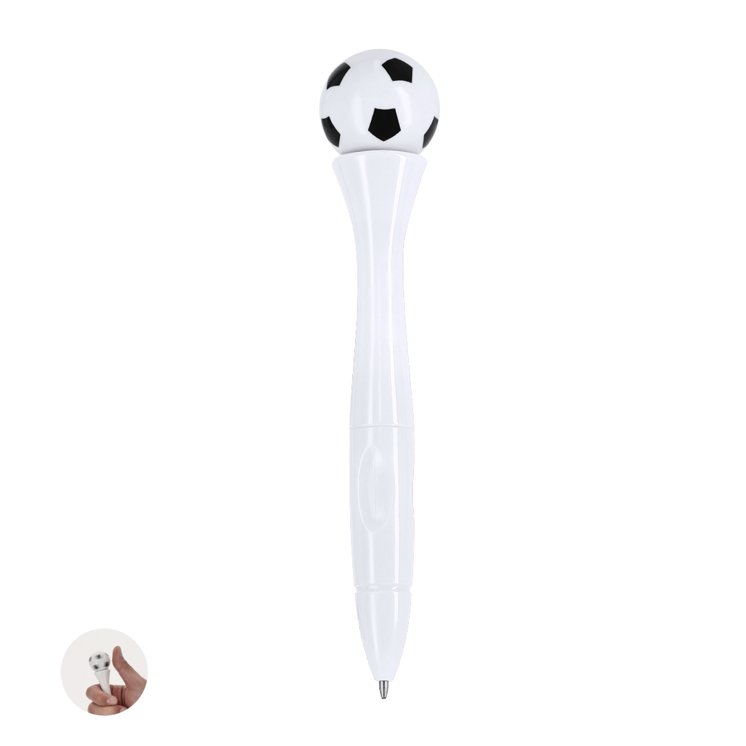 Bolígrafo antiestrés de mecanismo giratorio y diseño de balón de futbol. Cuerpo en acabado sólido brillante. Con tinta azul.