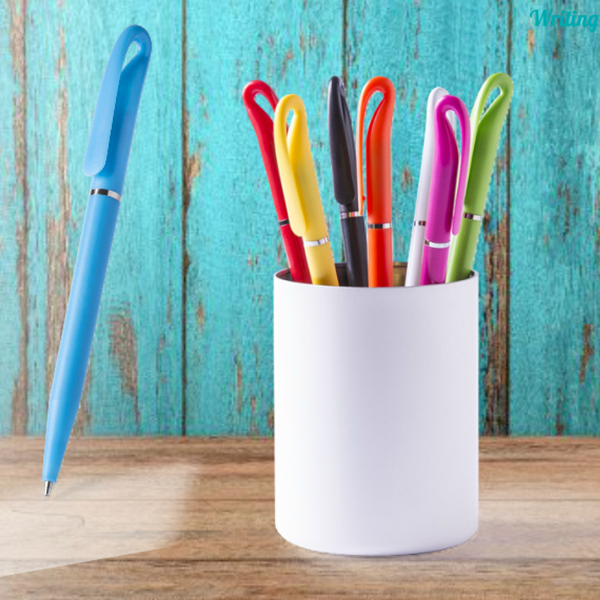 Bolígrafo de mecanismo giratorio con cuerpo de suave acabado en alegres colores sólidos. Con original clip de diseño curvado y anilla central plateada. Tinta azul.