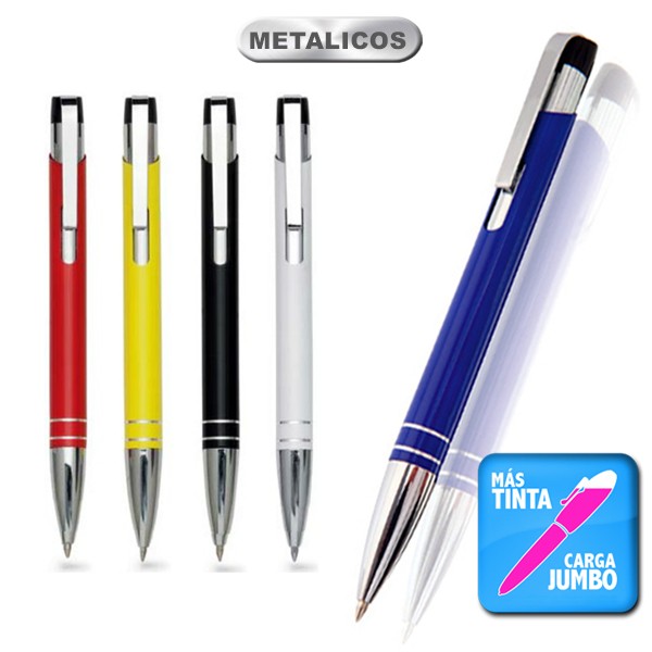 Original bolígrafo de mecanismo pulsador en elegante diseño bicolor. Con cuerpo troquelado en aluminio de suave acabado en variados colores. Original clip curvado, anillas y punta en plateado. De cartucho jumbo y tinta azul. Carga Jumbo