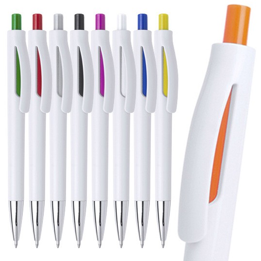 Bolígrafo de mecanismo pulsador de atrevido diseño bicolor con accesorios en vivos colores sólidos y cuerpo de suave acabado en color blanco sólido. Con original clip curvado a juego y punta en acabado brillante. Tinta azul.