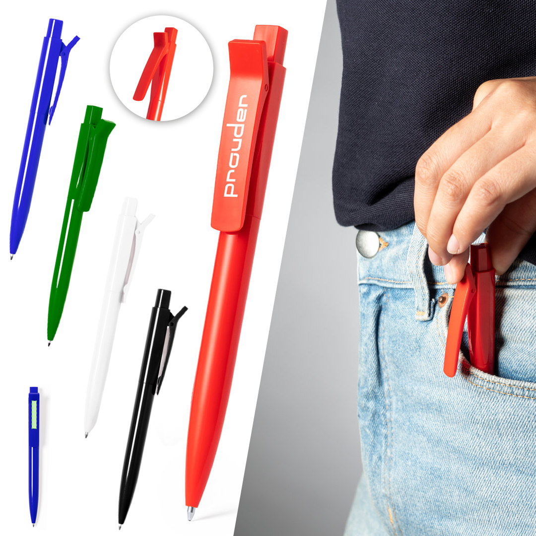 Original bolígrafo con clip pinza y fabricado en resistente ABS de acabado brillante. Disponible en variada gama de colores, con cartucho jumbo y tinta azul. Carga Jumbo