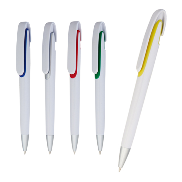 Bolígrafo de mecanismo pulsador de atrevido diseño tricolor con accesorios en vivos colores y cuerpo de suave acabado en color blanco sólido. Con original clip curvado a juego y cómoda empuñadura. Tinta azul.