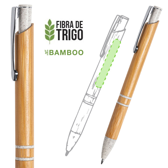 Bolígrafo con mecanismo pulsador de línea nature. Cuerpo en bambú, con punta en caña de trigo, para así fomentar la utilización de materias primas naturales y reducir las emisiones contaminantes y original clip metálico. De cartucho jumbo y en tinta azul. Carga Jumbo