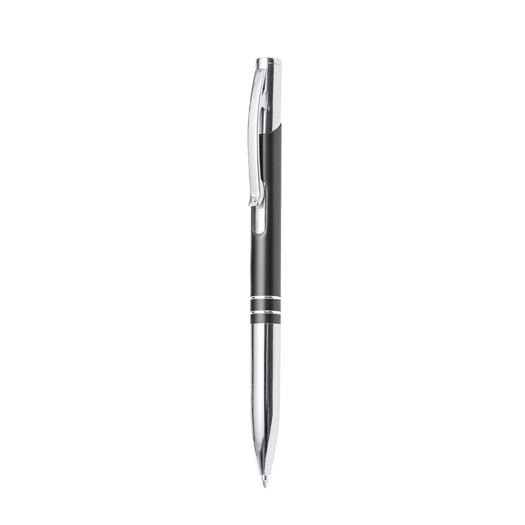 Original bolígrafo de mecanismo pulsador en elegante diseño bicolor. Cuerpo troquelado en aluminio de suave acabado en variados colores. Original clip, anillas y punta en plateado. En tinta azul.