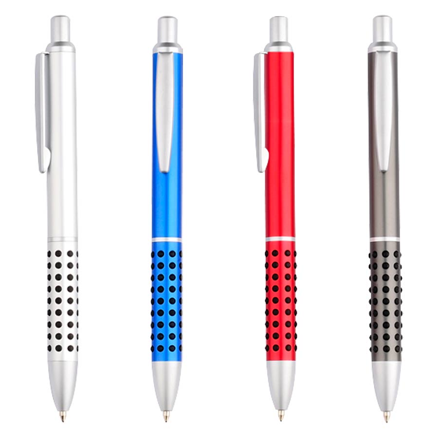 Bolígrafo metálico satinado modelo "Caterpillar", con lunares de goma negra que brindan una suave sensación de masaje dactilar al escribir. Escritura azul.