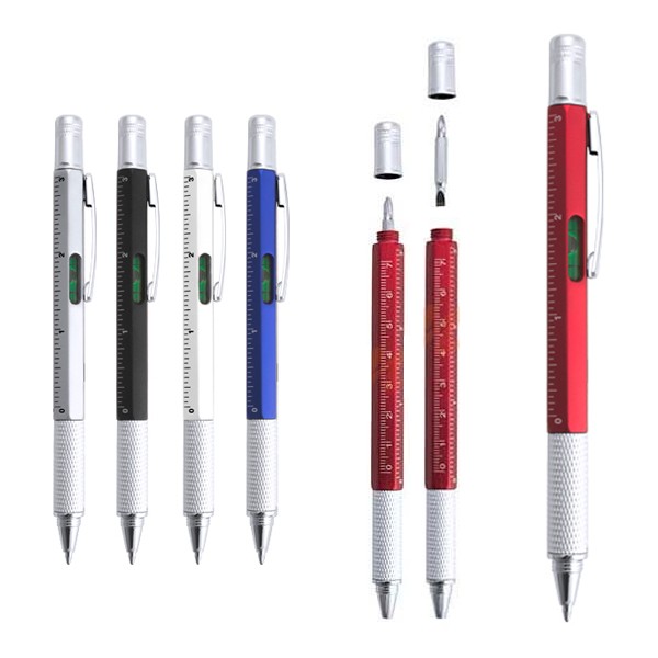 Bolígrafo multiherramienta 4 en 1 de mecanismo giratorio, en variados colores y con suave empuñadura. Con nivel integrado en cuerpo, regla con sistema métrico en centímetros/pulgadas y destornillador de doble cabeza -plana y de estrella-. Con clip metálico y tinta azul. 1 Accesorio. 5 Funciones