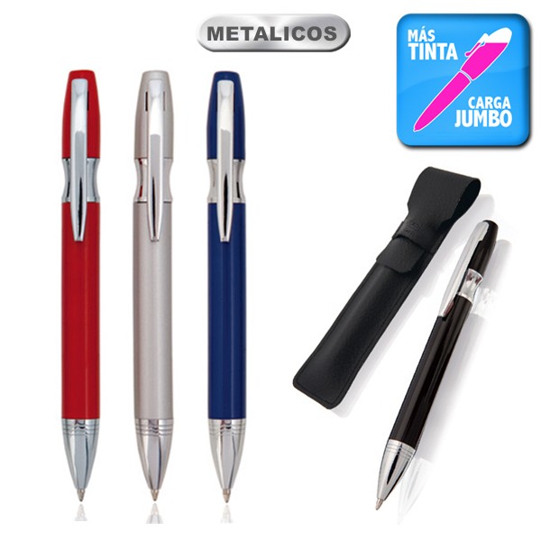 Bolígrafo de Alexluca de mecanismo giratorio en elegante diseño bicolor y suave cuerpo metálico en llamativos colores. Con original anilla, clip y punta en acabado plateado brillante y logotipo de la marca en parte superior. Presentado en funda individual de popiel en color negro con logotipo de la marca. De cartucho jumbo con tinta azul. Carga Jumbo. Funda Polipiel