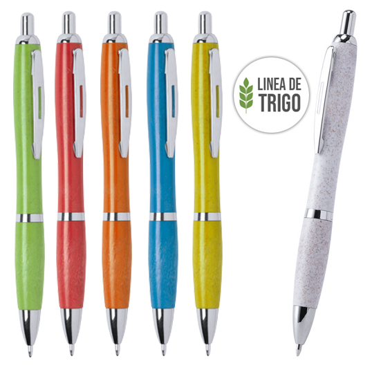 Bolígrafo de línea nature con cuerpo en caña de trigo, para así fomentar la utilización de materias primas naturales y reducir las emisiones contaminantes. De mecanismo pulsador, con detalles cromados y clip troquelado, cartucho jumbo y tinta azul. Disponible en variada gama de colores. Carga Jumbo