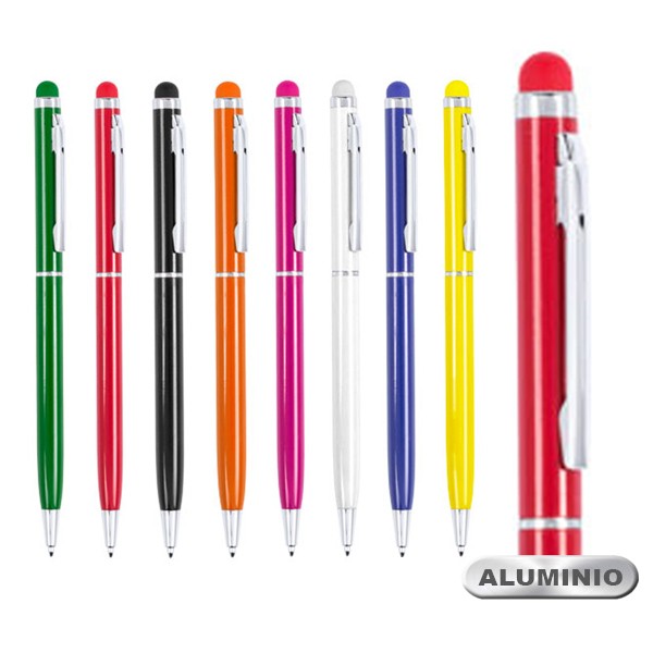 Bolígrafo puntero de mecanismo giratorio con cuerpo ultrafino en aluminio de suave acabado metalizado en variados colores y con puntero a juego. Accesorios y anillas en color plateado. Tinta azul.