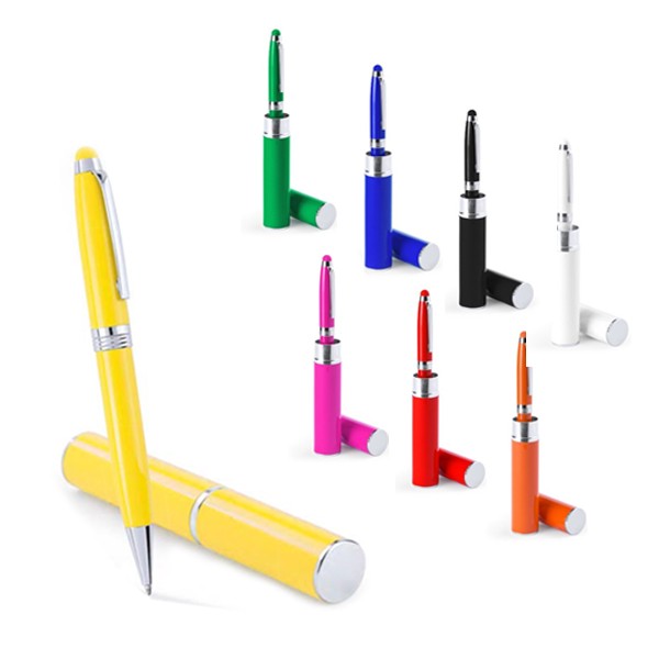 Bolígrafo puntero de mecanismo giratorio con cuerpo metálico de suave acabado en alegres colores. Accesorios y anillas en color plateado. Con puntero a juego y presentado en original estuche metálico a juego. De cartucho jumbo y tinta azul. Carga Jumbo
