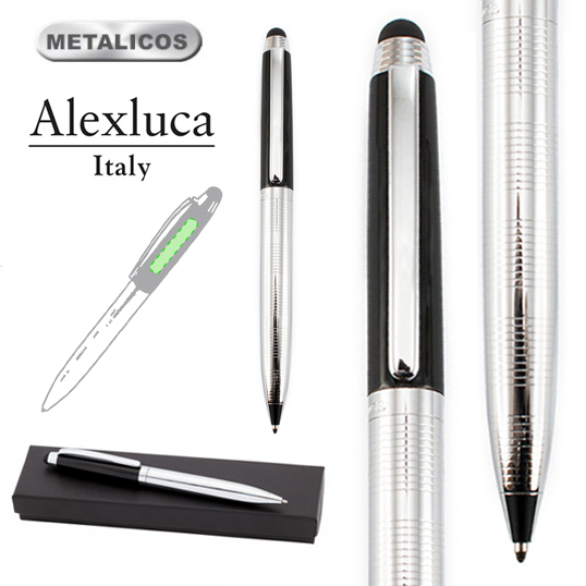 Bolígrafo puntero de Alexluca de mecanismo giratorio con suave cuerpo metálico, de elegante combinación de colores en plateado y negro. Clip y empuñadura de diseño a juego. Presentado en estuche individual negro con logotipo de la marca. Tinta azul.