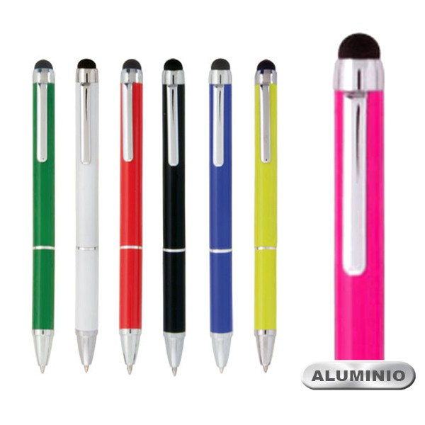 Bolígrafo puntero de mecanismo giratorio con cuerpo en aluminio de suave acabado metalizado en alegres colores. Accesorios y anillas en color plateado. Tinta azul.