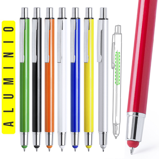 Bolígrafo puntero de mecanismo pulsador en desenfadados colores y con puntero a juego. Acabado en aluminio brillante y tinta negra. Tinta Negra