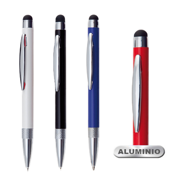 Bolígrafo puntero de mecanismo giratorio con cuerpo en aluminio de suave acabado metalizado en variados colores. Accesorios y anillas en color plateado. Tinta azul.